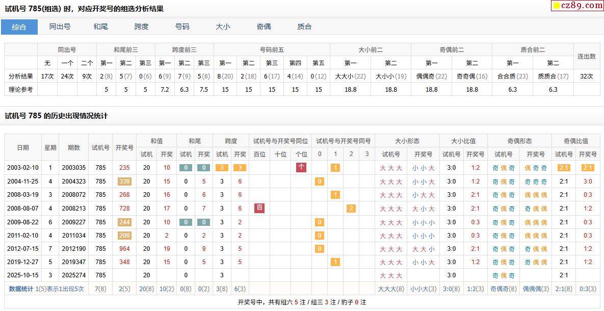 274期福彩3D试机号785对应开奖号的组选分析结果